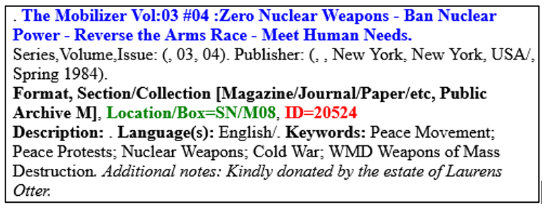 So, now that we are reorganised, what would happen if, for example, you looked up the item catalogued as 20524, our currently highest catalogue number? You would find the record for volume 3, number 4 of The Mobilizer: