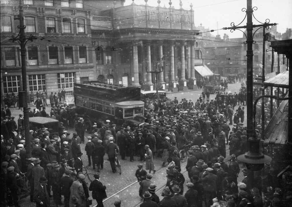 Credit: Nottingham City Council - Strikers blocking a bus driven by scabs on the first day of the strike, outside the Theatre Royal. We found this picture thanks to Nottingham and Derbyshire Labour History Society.